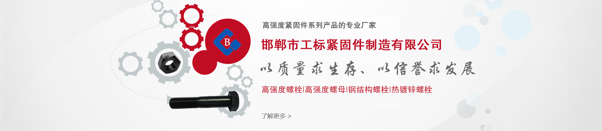 邯鄲市工標(biāo)緊固件制造有限公司位于標(biāo)準(zhǔn)件生產(chǎn)基地---河北省永年縣,是一家專業(yè)研發(fā)及生產(chǎn)鋼高強度緊固件系列產(chǎn)品的專業(yè)廠家。工標(biāo)緊固件公司擁有各類自動化生產(chǎn)及檢測設(shè)備,采用進(jìn)口及大型鋼廠原材料,以現(xiàn)代化企業(yè)制度為運營機(jī)制,保持產(chǎn)品質(zhì)量。 我們主要產(chǎn)品有:高強度螺栓、高強度螺母、鋼結(jié)構(gòu)螺栓、扭剪型螺栓、塔吊螺栓、高強度加長螺栓、焊釘,鋼結(jié)構(gòu)用大六角頭高強度螺栓連接副、鋼結(jié)構(gòu)用扭剪型高強度螺栓連接副、鋼網(wǎng)架螺栓球節(jié)點用高強度螺栓、高強度內(nèi)外六角螺栓系列,玻璃幕墻T型螺栓,T型槽螺栓,地腳螺栓,雙頭螺栓,四方頭螺栓,各種異型螺栓、熱鍍鋅螺栓、達(dá)克羅螺栓,國內(nèi)外標(biāo)準(zhǔn)各類高強度緊固件,可訂做各種高強度異型件。產(chǎn)品廣泛用于航天、建筑、交通、電力、軍工等行業(yè),經(jīng)過多年發(fā)展,產(chǎn)品質(zhì)量與售后服務(wù)得到了客戶及業(yè)界人士的好評!